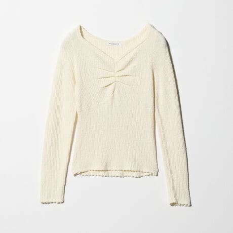 タックを前身頃に寄せた甘さのあるディテールでありながら、広めの首の開きでヘルシーな印象に仕上げました。