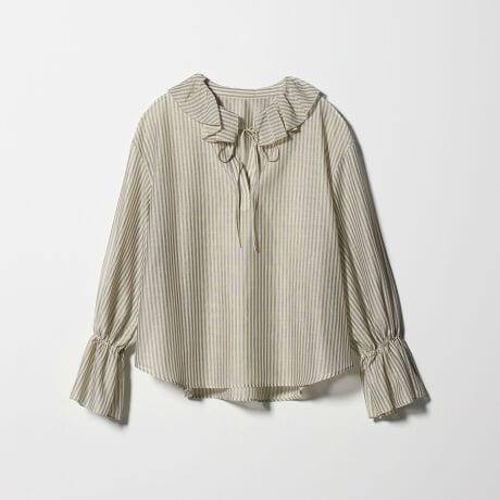 立体感のあるラッフルフリルとストライプ柄が映えるブラウス。
