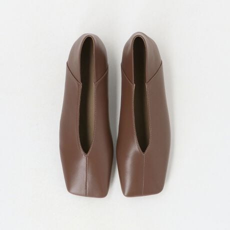 オブリークの広めなスクエアトゥが目を惹くソフトフラットシューズ。
