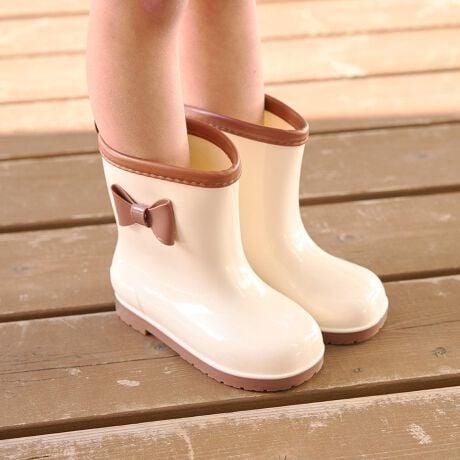 大きなリボンと縁取りのバイカラーが魅力的なレインブーツです。