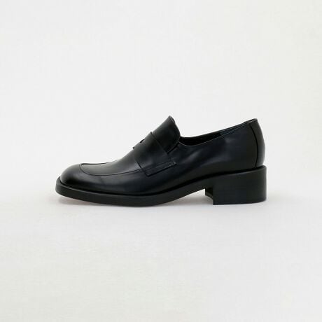 ワイドなスクエアトゥに、ほんのりオブリークラインを取り入れたローファー。