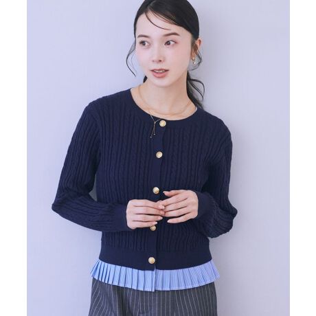 重ね着風デザインでコーデが完成する上品ニットケーブル編みの立体感が上品な印象を与え、裾に施したプリーツがさりげない華やかさを添えています。レイヤードしているように見えるデザインなので、これ一枚で着こなしが決まり、忙しい朝にも心強い存在です。身頃はすっきりとしたシルエットで、パンツにもスカートにも合わせやすく、着回し力の高さが魅力です。程よい厚みのニット素材は季節の変わり目にも活躍し、長時間着ても快適に過ごせます。ボタンを留めてきちんと感を出したり、前を開けて軽く羽織ったりと表情を変えられるのも嬉しいポイントです。上品さとカジュアルさのバランスが良く、通勤から休日まで幅広いシーンで活躍します。シンプルながらもデザイン性があり、コーデに悩まずおしゃれを楽しめる一着です。透け感[なし]