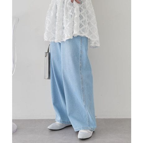 大人カジュアルに差がつくスタッズデニムベーシックなデニムに繊細なスタッズを施し、上品さと遊び心を両立したデザインです。光を受けて控えめにきらめくスタッズが、シンプルな装いのアクセントになります。程よくゆとりのあるシルエットで動きやすく、リラックス感がありながらもだらしなく見えません。腰回りから脚のラインまできれいに見せてくれるため、体型カバーにも役立ちます。カジュアルなスニーカー合わせはもちろん、パンプスやローファーを合わせれば落ち着いた印象にも仕上がります。デイリー使いからお出かけまで幅広いシーンで活躍し、着回し力の高さも魅力です。いつものデニムスタイルを格上げしたい方におすすめです。透け感[なし]