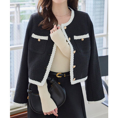 ショート丈でバランスよく着こなせ、釦を閉じてトップスとしても羽織りとしても着回せるノーカラージャケットです。