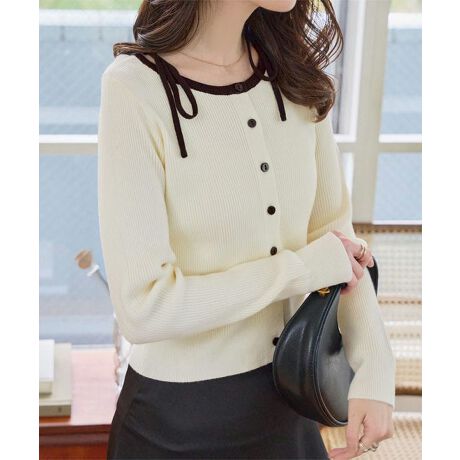 [型番:N1319]肩にあしらわれたリボンがポイントとなり、さりげないアクセントで甘さをひとさじプラス。フロントボタンで、羽織りとしても一枚着としても着まわせる万能カーディガンです。【素材・サイズ感】伸縮性のあるリブニット。程よくフィットするシルエットが上半身をすっきり見せてくれます。インナーにタンクトップを仕込んで、ボタンを開けた抜け感スタイルも◎#コウベレタス