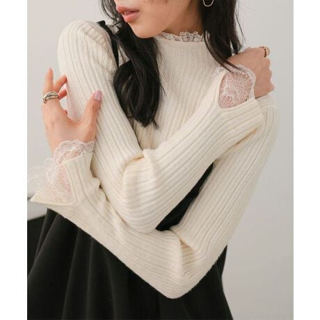 トレンドの大人気レースデザインから、1枚でレイヤード風のデザインが楽しめるレースドッキングニットが登場。