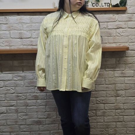 胸元と背中に、贅沢な「うねうね」とした変形ピンタックを施したデザインブラウスです。