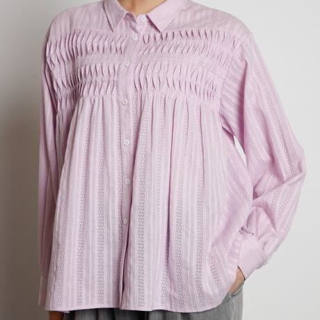 胸元と背中に、贅沢な「うねうね」とした変形ピンタックを施したデザインブラウスです。