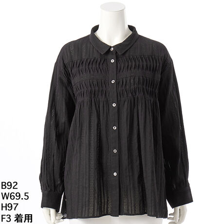 胸元と背中に、贅沢な「うねうね」とした変形ピンタックを施したデザインブラウスです。