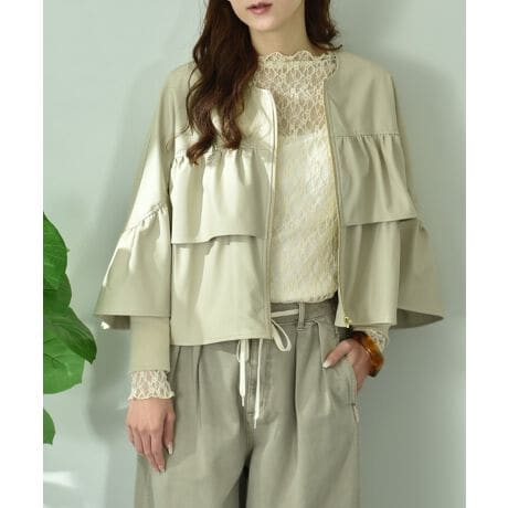ハードなイメージのフェイクレザーをフェミニンな印象に演出してくれるお勧めな1枚。袖口にリブを使用し、よりフリルが立体的になるように細部までこだわりました。合わせやすいノーカラーと着丈に仕上げているのでスタイリングに悩みません。今季は女性らしいプリーツや大人っぽいナロースカート、またワンピースを合わせた大人フェミニンスタイルがお勧めです。