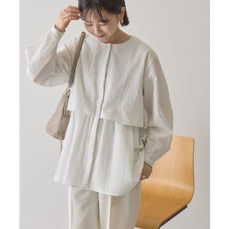 一枚でレイヤード風スタイルが決まるティアードデザインブラウス。凹凸のあるサッカー生地で春らしい爽やかな着こなしを演出します。ふんわり広がるシルエットがフェミニンながらも、比翼仕立てのノーカラーで全体をすっきりと引き締めるアクセントをプラス。合わせるボトムや小物次第でカジュアルからきれいめまで幅広いスタイルでお楽しみいただけます。透け感[ややあり]