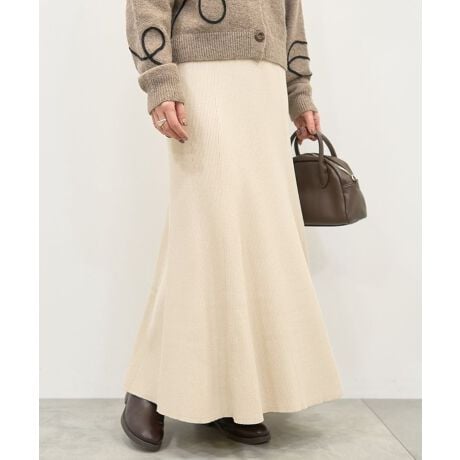 細畝のリブ素材で仕立てたデザインスカート。腰回りは程よくフィットしつつ、緩やかに広がるマーメイドラインが女性らしく美しいシルエットを演出します。ウエストゴムで楽に着脱出来、内側の紐でお好みのサイズに調節も可能。カジュアルなスウェットからフェミニンなブラウスまで幅広く合わせて頂ける万能アイテムです。透け感[なし]
