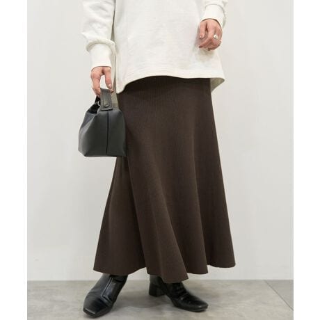 細畝のリブ素材で仕立てたデザインスカート。腰回りは程よくフィットしつつ、緩やかに広がるマーメイドラインが女性らしく美しいシルエットを演出します。ウエストゴムで楽に着脱出来、内側の紐でお好みのサイズに調節も可能。カジュアルなスウェットからフェミニンなブラウスまで幅広く合わせて頂ける万能アイテムです。透け感[なし]
