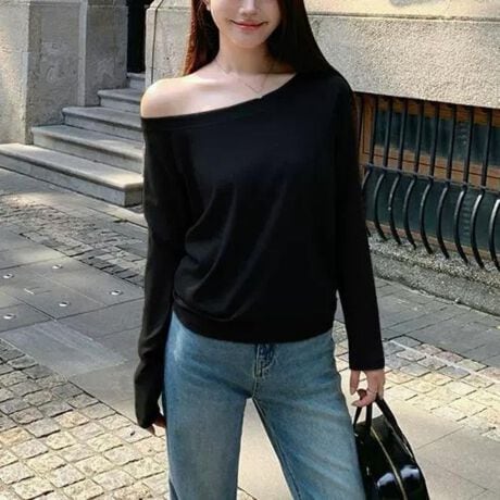 デコルテをきれいに見せるオフショルダーデザインのカットソー。