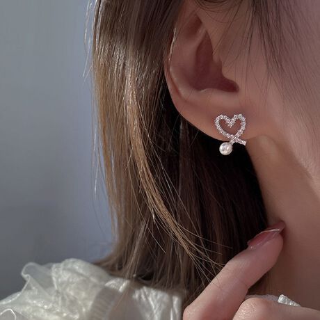 繊細なラインストーンで描いたハートに、パールを添えた上品なピアス。