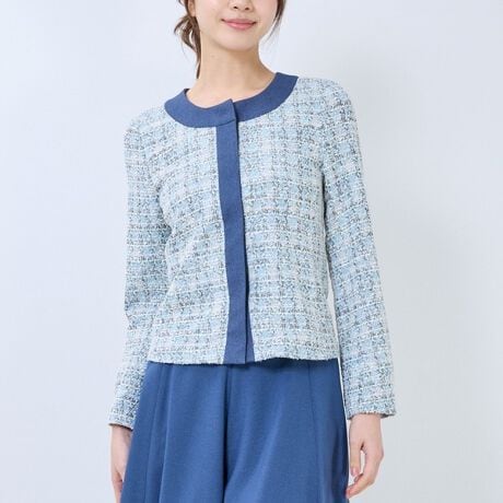 上品な質感と華やかなムードを演出するツィード生地で仕立てられたカーディガン。襟から前立てにかけて配色を施すことで、メリハリのあるスタイリングと表情感をプラスします。フロントから見えないスナップボタンですっきりとした印象に。生地にはストレッチ性があるので、締め付け感が少なく快適な着心地を実現します。スカートはもちろん、スラックスと組み合わせたコーディネートもおすすめです。