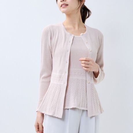 軽やかな透かし編みが魅力の、定番ペプラムカーディガン。ペプラム部分の編地を新たにブラッシュアップし、軽やかで女性らしい表情を演出しています。編地とともにシルエットも見直し、細さを感じさせながらも窮屈にならない絶妙なバランスにこだわりました。羽織るだけでスタイリングに程よい華やかさを添え、日常使いからきれいめまで幅広く活躍します。