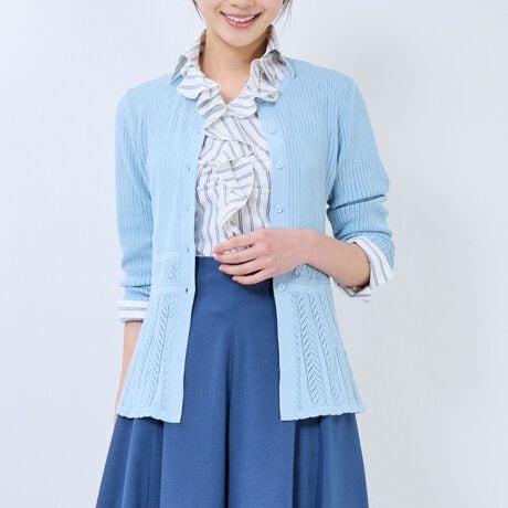 軽やかな透かし編みが魅力の、定番ペプラムカーディガン。ペプラム部分の編地を新たにブラッシュアップし、軽やかで女性らしい表情を演出しています。編地とともにシルエットも見直し、細さを感じさせながらも窮屈にならない絶妙なバランスにこだわりました。羽織るだけでスタイリングに程よい華やかさを添え、日常使いからきれいめまで幅広く活躍します。