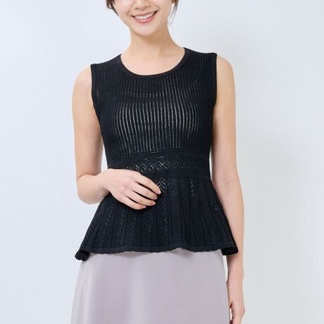 カーディガンと同素材の編地を使用した、透かし編みペプラムノースリプルオーバー。軽やかな透かし編みが涼しげな印象を与え、夏に向けた一枚着として活躍します。シャツやカットソーをインナーに重ねることで、ベスト感覚のレイヤードスタイルも楽しめます。ペプラムシルエットがさりげなく体のラインを引き立て、シンプルな着こなしに程よいアクセントを添える一着です。