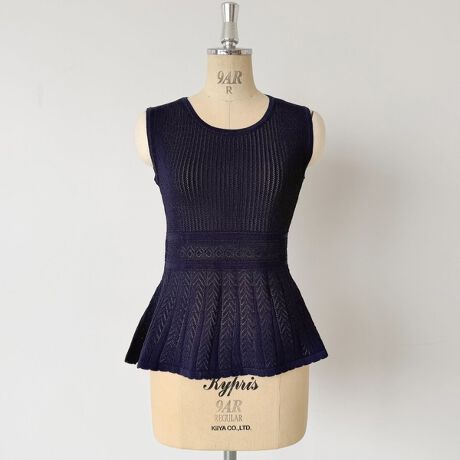 カーディガンと同素材の編地を使用した、透かし編みペプラムノースリプルオーバー。軽やかな透かし編みが涼しげな印象を与え、夏に向けた一枚着として活躍します。シャツやカットソーをインナーに重ねることで、ベスト感覚のレイヤードスタイルも楽しめます。ペプラムシルエットがさりげなく体のラインを引き立て、シンプルな着こなしに程よいアクセントを添える一着です。