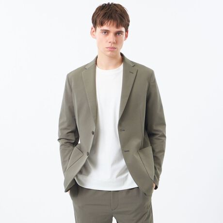 シングル2つボタン、パッチポケットモデル。ベント無し、背裏、袖裏もない一枚仕立てなのでカーディガン感覚で羽織れるジャケット。