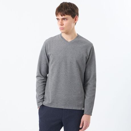 上品なVゾーンが演出できる定番の長袖Tシャツです。裾は後身頃を少し長くすることにより、背中が出にくいスマート設計になっています。
