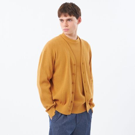 ゆったりとしたシルエットのVネックニットカーディガンです。前立ての矢振りの編み柄がプレーンなカーディガンデザインのアクセントになっています。フロントボタンの数をやや多めにしてクラシックな雰囲気です。
