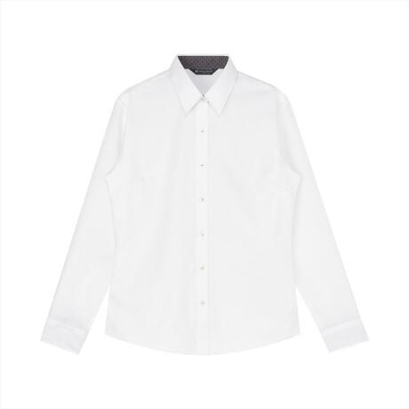 生地・ボタンをシンプルな白でまとめ別布でメリハリを加えた上品な一品。仕様を抑えつつも洒落感あるシャツスタイルを楽しみたい方におすすめ。