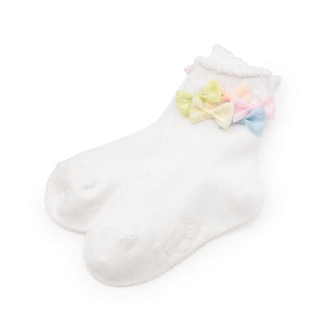 メゾピアノで大人気の継続アイテムである、リボンいっぱいのクルーソックスです。華やかなサテンオーガンジーリボンをそれぞれ絶妙なカラーリングで配色しました。発表会やパーティーなど、さまざまなシーンで大活躍するデザインです。足裏にすべり止めプリントがついています。【リンク】お揃い品番:6061433