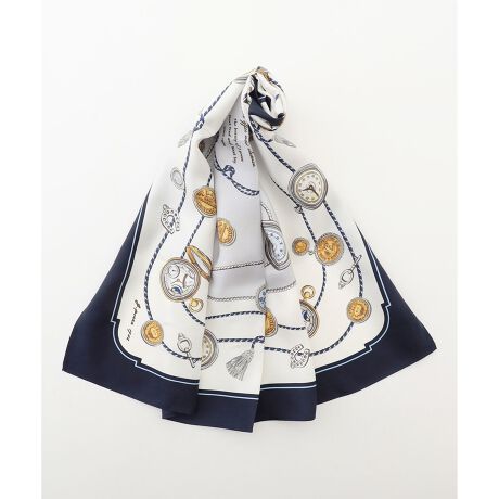 ■デザイン肩にも掛けられ、首にも巻きやすい、扱いやすいミディアムサイズのスクエアスカーフ。バッグチャームやヘッドバンダナとしてもアレンジできます。デザインはコインや時計をあしらった、トラディショナルなイメージを感じさせるプリント柄に。上品な柄でスカーフが初めての方も扱いやすいデザインに仕上げました。いつものコーディネートにプラスするだけでお洒落な印象になり、シンプルな装いにはもちろんトレンチコートや、紺ブレ・Pコートにもぴったりのスカーフです。キャメル(#534)はやさしいキャメルを基調に統一感のある配色デザイン、ネイビー(#575)はネイビーを基調にコインのイエローとコントラストのあるトラディショナルなデザインです。