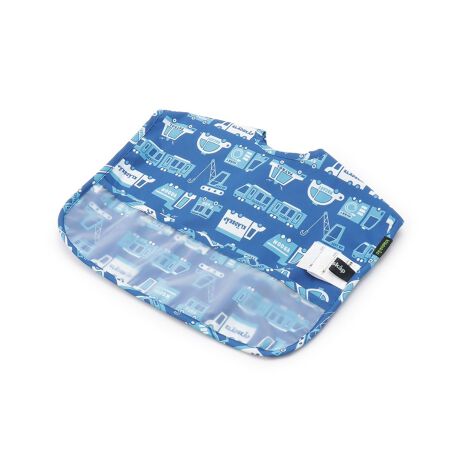 働く車と恐竜を描いた総柄のお食事スタイです。