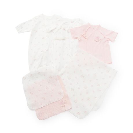 かわいいが大好きなプレママにオススメの赤ちゃんはじめてセットです。2WAYオール、コンビ肌着、短肌着、ガーゼハンカチ2枚、沐浴ガーゼの6点でメゾピアノデビューにおすすめの生まれてからすぐ使えるアイテムで揃えました。こちらをベースに買い足していくとスムーズに出産準備ができます。オフホワイトがリボン柄、ライトピンクがバラ柄で土台色によって柄が異なります。2WAYオールとコンビ肌着には掛け間違い防止のカラーボタン付き。服は弱酸性生地になります。
