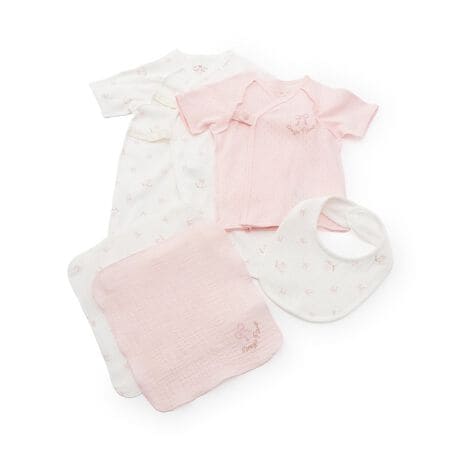 かわいいが大好きなプレママにオススメの赤ちゃんはじめてセットです。コンビ肌着、短肌着、ガーゼハンカチ2枚、スタイの5点でメゾピアノデビューにおすすめの生まれてからすぐ使えるアイテムで揃えました。こちらをベースに買い足していくとスムーズに出産準備ができます。オフホワイトがリボン柄、ライトピンクがバラ柄で土台色によって柄が異なります。コンビ肌着には掛け間違い防止のカラーボタン付き。服は弱酸性生地になります。