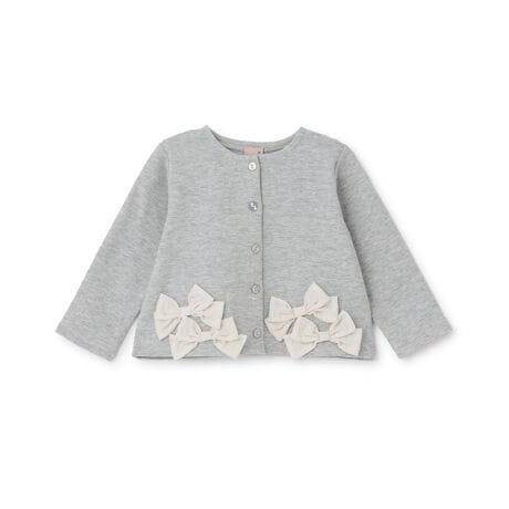 裾にほどこされたリボンモチーフが華やかなポイントのカーディガンです。さまざまなボトムと相性が良く、幅広い着こなしを楽しめます。ガーリースタイルにもカジュアルなコーデのアクセントにも使いやすい一着。大人サイズ(品番:3351210)とお揃いで着用できます。内側にお名前を記入できるタグつき。