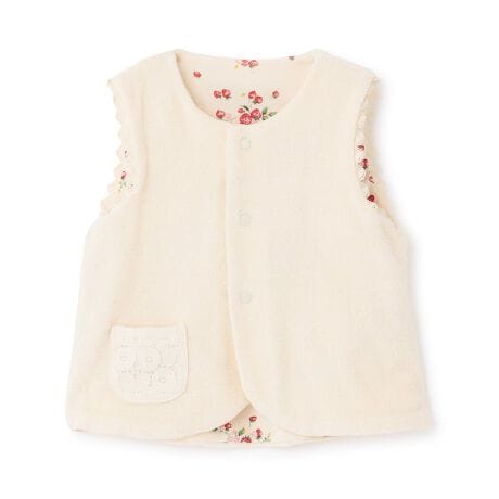 可愛らしい野イチゴを繊細に描いたリバーシブルベストです。表面はレースポケットつきの無地、裏面は個性あふれる総柄になっています。お洋服の上から重ねやすく、着こなしに合わせてアレンジできるのが魅力。生地にはオーガニックコットンを使用しています。【おすすめの着用時期は春夏シーズン】