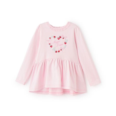 小さないちごとリボンの繊細な刺しゅうが入った長袖Tシャツです。首元のフリルで可愛らしいデザインに仕上げました。やさしい肌触りの綿素材を使用しており、着心地も快適。ウエストからふわっと膨らむペプラムシルエットで、レギンスやパンツとも好相性です。内側にお名前を記入できるタグつき。