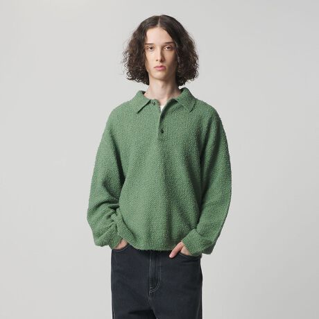 表面がくるくるとカール(縮れ)したような表情を持つカールヤーンを使用したポロシャツ。