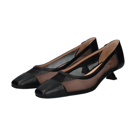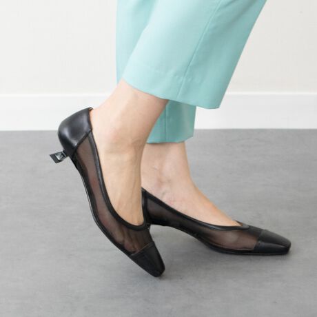 細身に設計されたスクエアトウがスタイリッシュなローヒールパンプスはチュールの抜け感が涼しげな一足。
