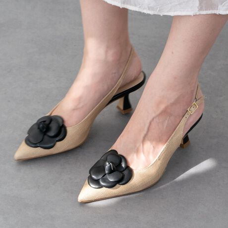 カメリアモチーフのデザインが印象的なポインテッドトウのバックバンドパンプスが「ファビオルスコーニ」から登場しました。