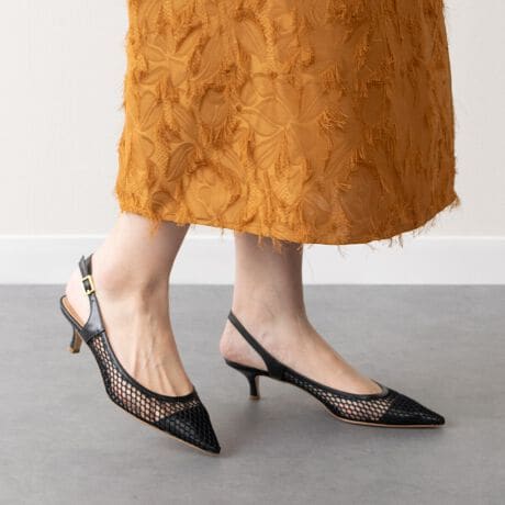 ヌーディーで涼し気な素材感のバックバンドパンプスはヒールの高さも程よく、使い勝手の良い一足です。