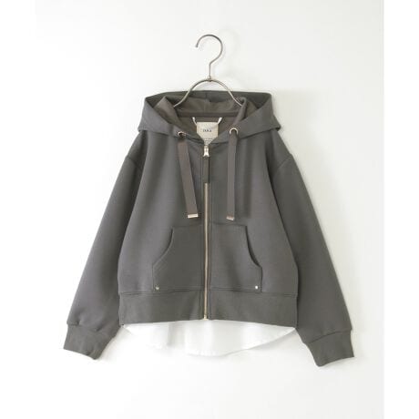 [型番:13231818]裾からシャツをのぞかせたレイヤード風デザインが、一枚でコーデを華やかにしてくれるジップパーカー。クリーンな表面感のダンボール素材が上品さを引き立て、ゴールドカラーのハトメや、フードにあしらったグログランテープなど、細部までこだわったディテールが魅力です。【デザイン】フードは取り外し可能で、シーンに合わせて着こなしをアレンジできるのもうれしいポイント。