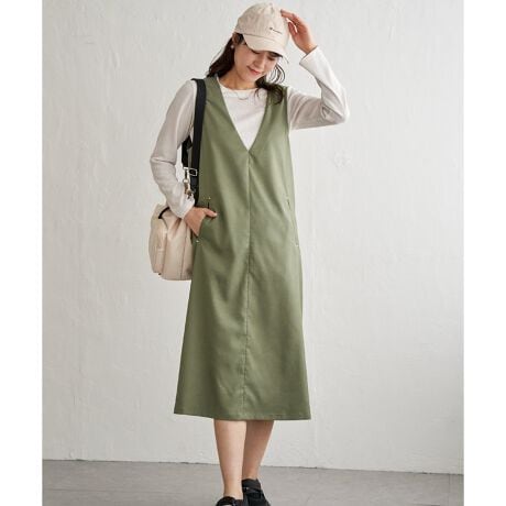 一枚で決まる!Vネックが胸元をすっきり見せするジャンスカとインナーのセット商品。
