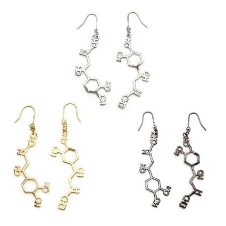 アドレナリンの構造式をアクセサリーにしました。複雑な構造式が幾何学模様のようにも見え、オシャレな雰囲気も感じさせてくれます。