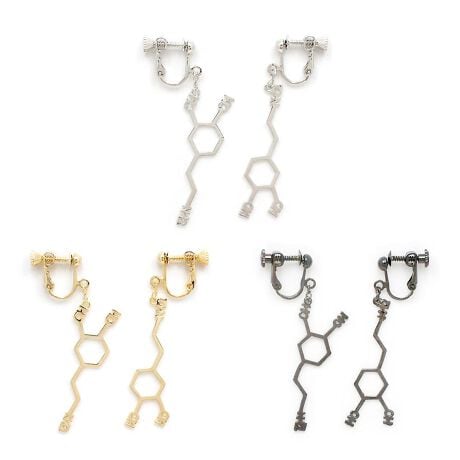 別名「生きる意欲を作るホルモン」と言われるドーパミンの構造式をアクセサリーにしました。ユニークながらもスッキリとした形でスタイリッシュさを演出してくれます。