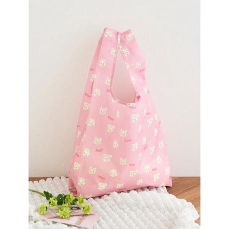 オサムグッズのキャラクターが散りばめられたピンクの総柄ショッピングバッグ。