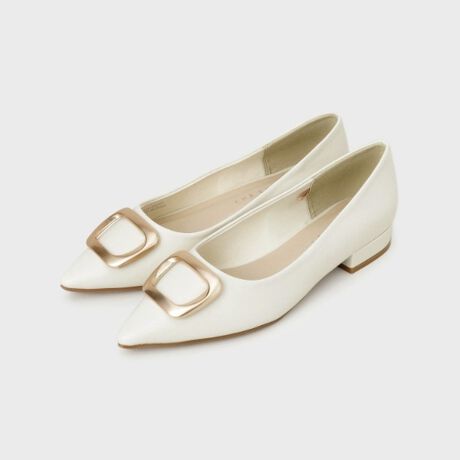 メタルバックルが上品に映えるポインテッドトゥのフラットパンプス。