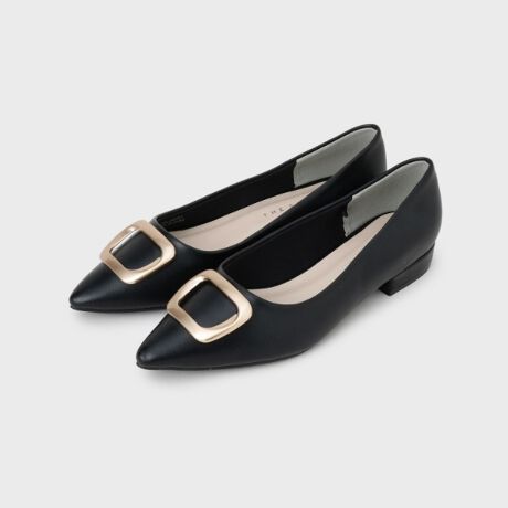 メタルバックルが上品に映えるポインテッドトゥのフラットパンプス。