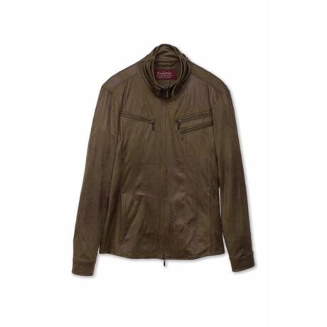 スェード調ダンボール素材に絶妙なフォイルプリントを施し、デザイン性のみならず伸縮性も併せ持った一着となっています。