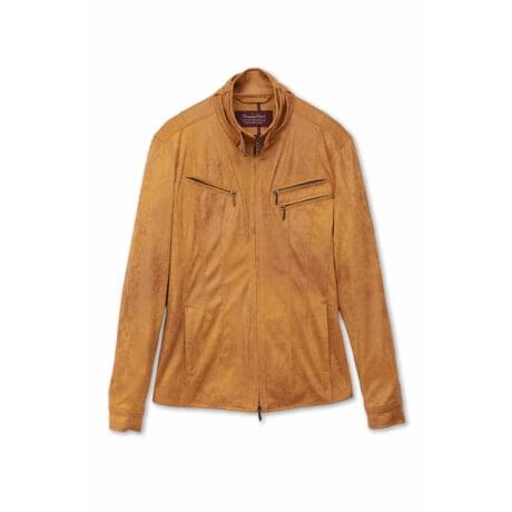 スェード調ダンボール素材に絶妙なフォイルプリントを施し、デザイン性のみならず伸縮性も併せ持った一着となっています。