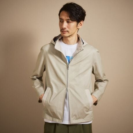 小さな通気孔のあるストレッチ・ファブリックを使用したフード着脱式の軽量ブルゾンです。